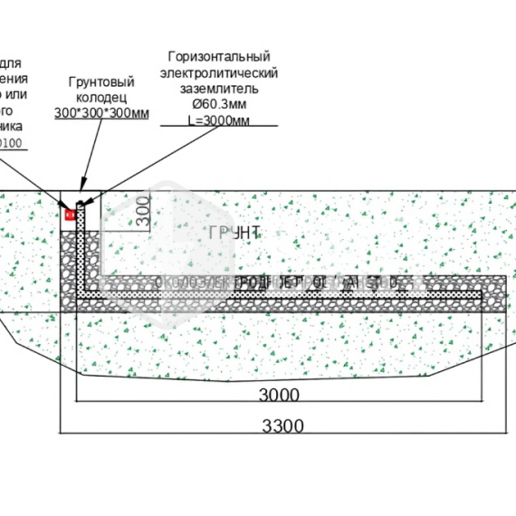 Электрод монтируется горизонтально в подготовленную траншею глубиной 0,7 - 0,9 метра и длиной 3700 см и засыпается околоэлектродным заполнителем - активатором грунта.